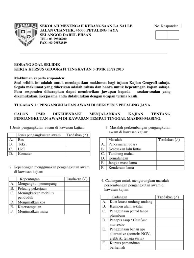 Pantun sebagai pelengkap wacana pengucapan awam. Kerja kursus geografi mrsm tun mustapha 2013. Kajian ini menggunakan metodologi pengedaran borang soal selidik dan temu bual kepada pengguna dan pengusaha perahu tembeling. Walaupun pelbagai inisiatif telah dilakukan oleh pihak kerajaan dalam menyediakan kemudahan seperti ini. Contoh soal selidik geografi pt3 2016 pengangkutan awam.